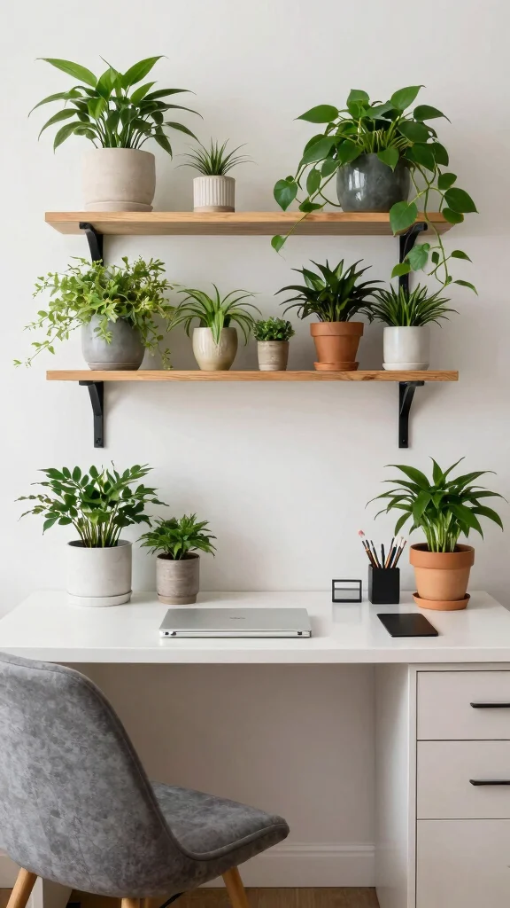 Incorporating greenery not only uplifts your room but also fosters a calming environment, boosting your productivity as you work.