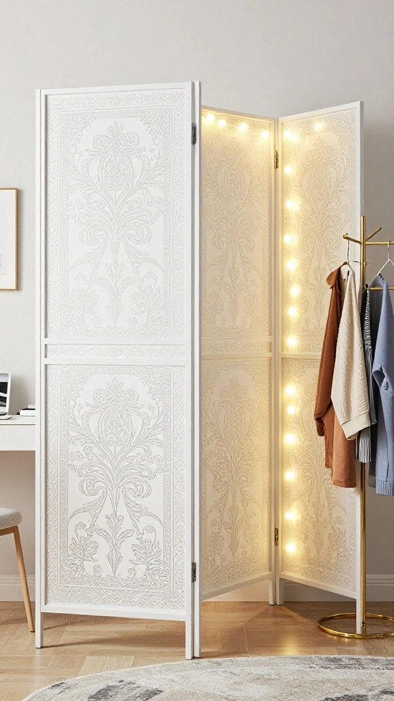 For a touch of artistry, choose a screen with a unique design or vibrant color that makes a statement. Adding fairy lights along the edges can create a cozy ambiance, while a trendy coat rack nearby allows for easy outfit changes.