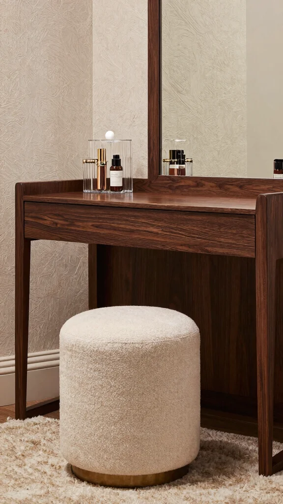 To bring textures into your design, select a vanity with a unique wood finish that adds warmth. Soft stools or poufs can create comfort, while glass organizers introduce a modern elegance.