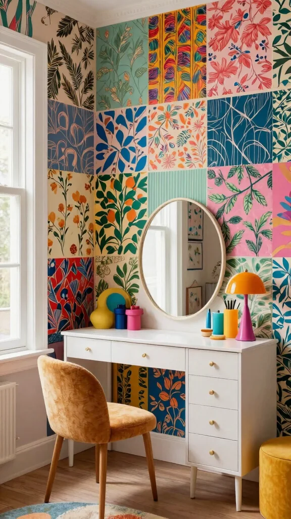 Embrace your artistic side by creating a colorful collage of different wallpapers in your dressing room. Mix and match various patterns, textures, and colors to craft a unique space that truly reflects your personality. Ensure that each wallpaper is made from sustainable materials to maintain an eco-friendly approach.