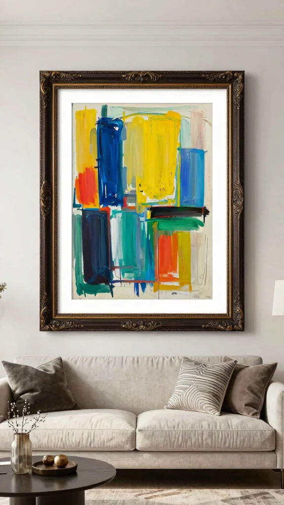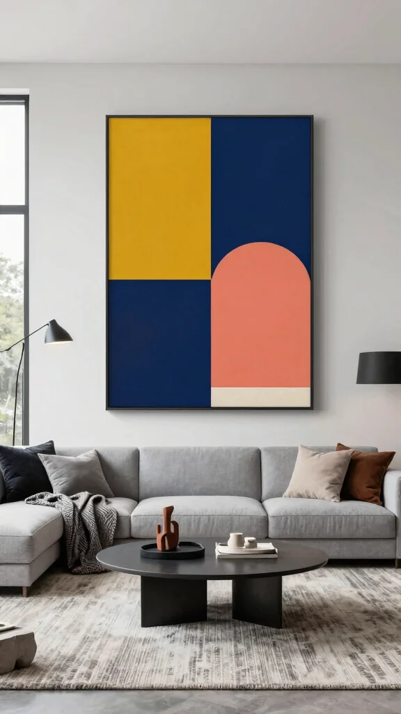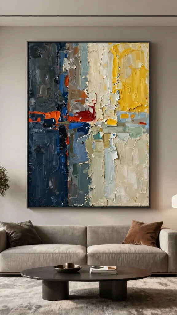 Style and color: Choose a palette that echoes your living room ideas. A bold abstract oversized artwork can become the focal point, while neutrals surrounding it keep the space calm. This approach works well for statement wall decor or modern wall hangings in a minimalist setting.