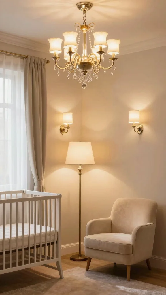 Choose elegant fixtures like chandeliers or stylish pendant lights that enhance the space’s luxury without sacrificing functionality. Soft, adjustable lighting is perfect for nighttime feedings, while decorative lamps can create a warm day-time glow. Consider the convenience of dimmable lights to match the time of day, and opt for eco-friendly LED bulbs to maintain sustainability.