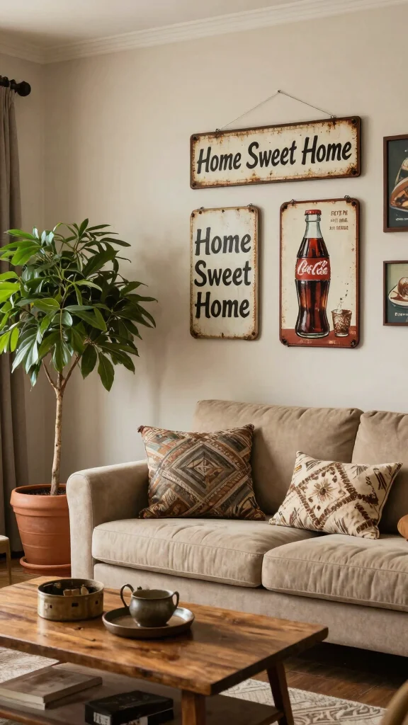 Rustic metal signs infuse your living room with character and charm while enhancing a cozy, industrial vibe. With designs ranging from vintage advertisements to custom family names, these signs provide a unique way to express your personality and interests. Consider placing a rustic sign above your fireplace or on a feature wall to create an inviting focal point that draws the eye.