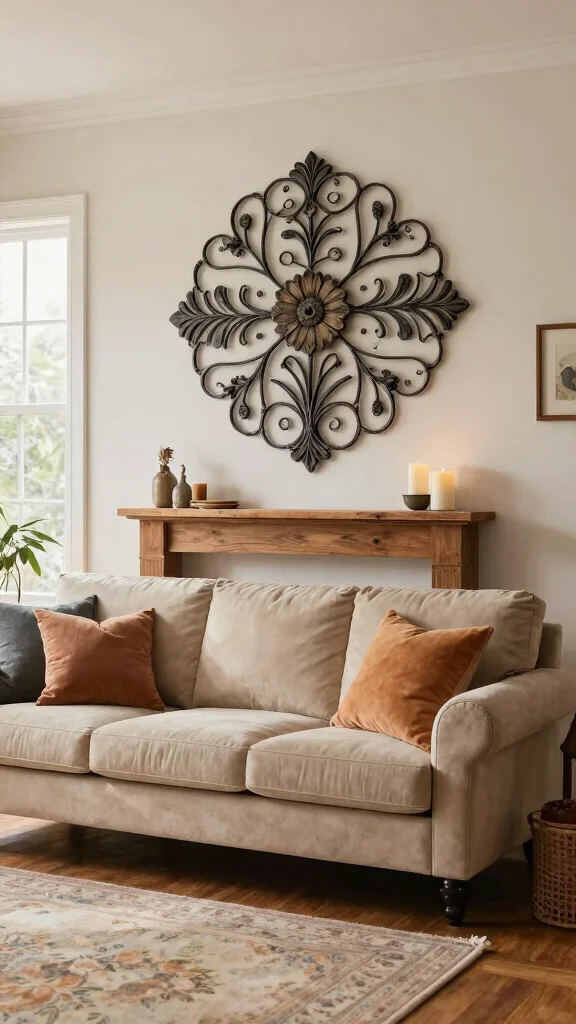 Wrought iron wall art introduces a timeless elegance to your living room while maintaining a rustic industrial charm. With intricate designs often seen in floral or abstract patterns, these pieces showcase craftsmanship and tradition. A large wrought iron piece can serve as a stunning centerpiece, particularly above a fireplace or on a prominent wall.