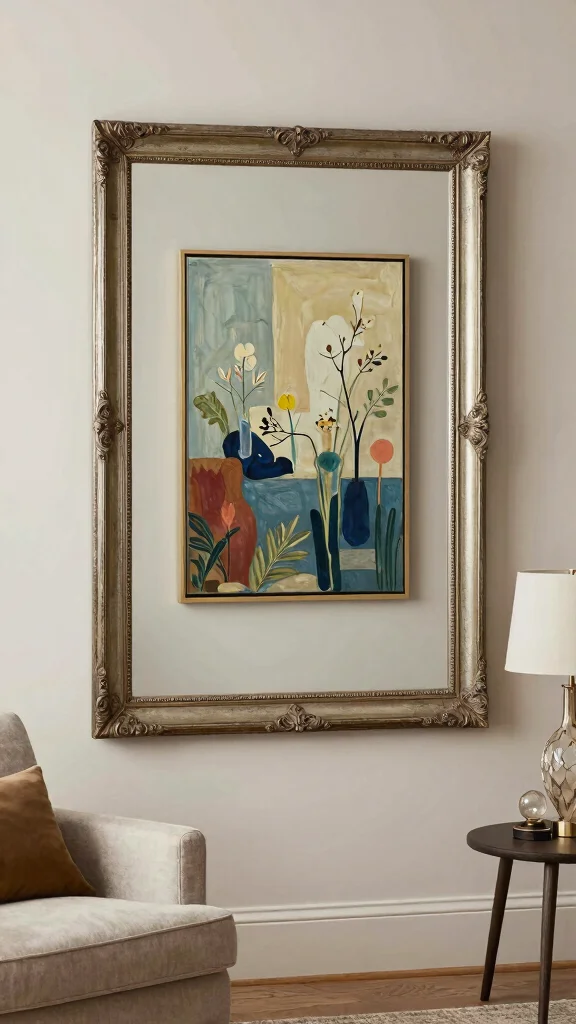 Combine artworks with vintage mirror frames to create a multi-dimensional aesthetic in your living room. Mirrors with wide frames can house smaller pieces of art, blending functionality with artistic expression. This arrangement brings warmth and personality into your space while beautifully reflecting light.