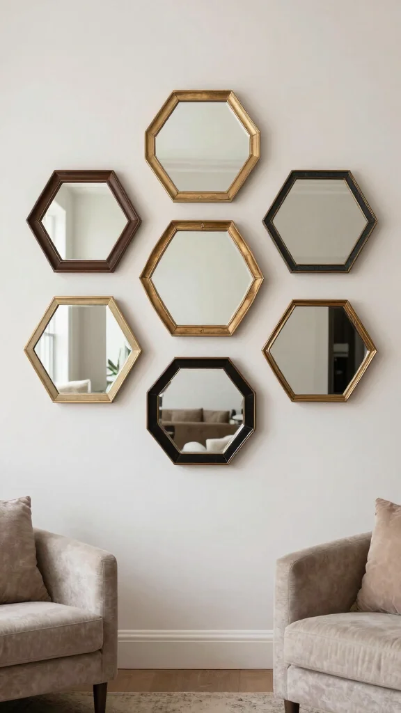 Mix and match different shaped mirrors, like hexagonal and circular, to create an intriguing visual effect.