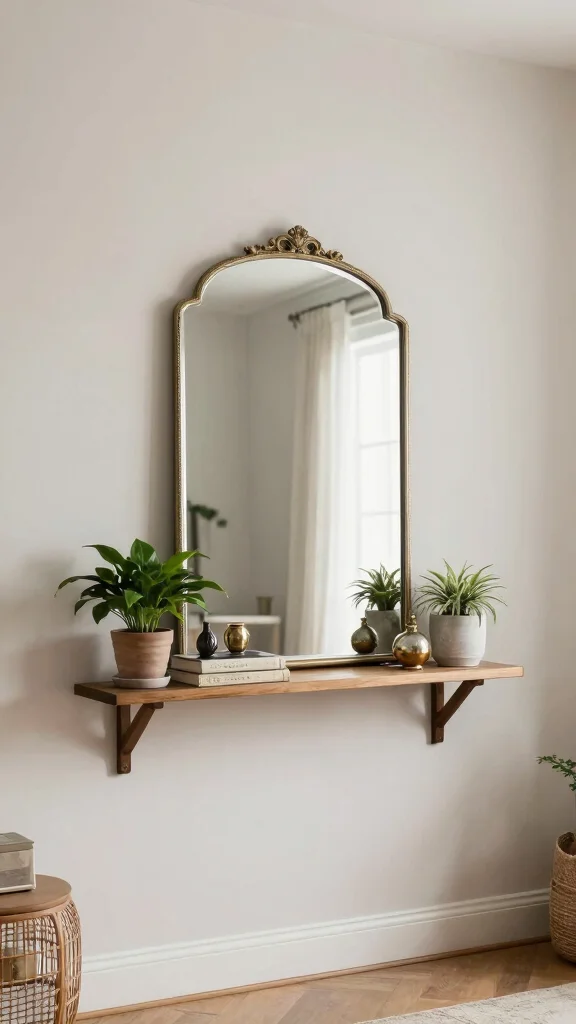Install vintage mirror shelf displays to combine functionality with style, showcasing decor items elegantly.