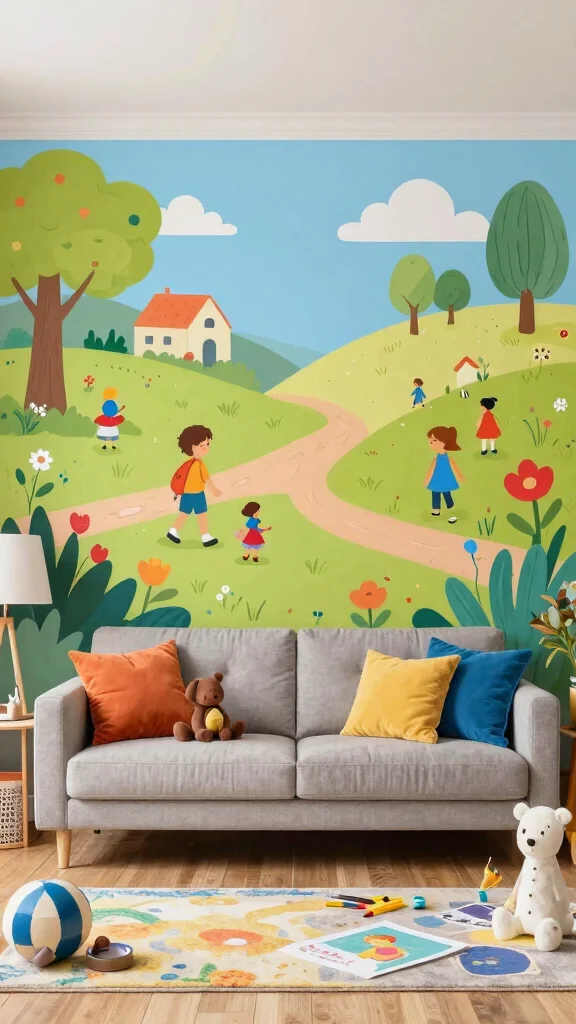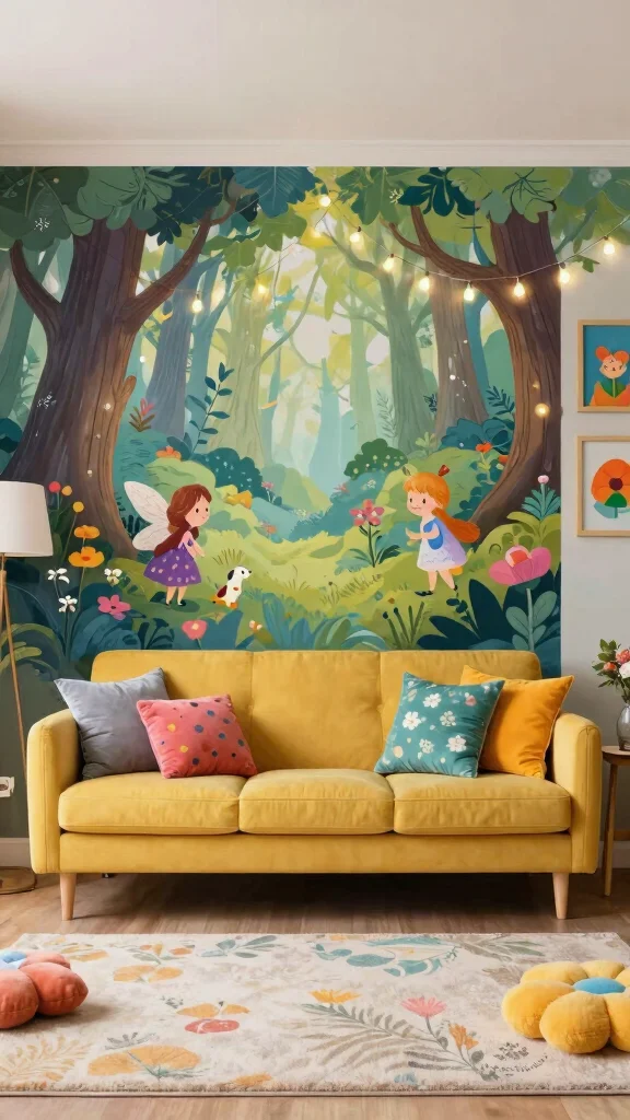 A whimsical mural can invigorate your living room, making it a delightful space for both kids and adults.