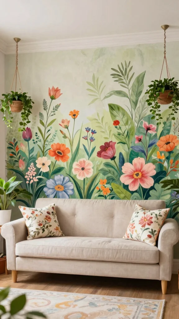 To effectively style with florals, use a variety of floral patterns in your textiles for a cohesive look. Incorporating greenery through potted plants or hanging planters enhances the natural vibe. Keeping the furniture light and airy balances the boldness of the mural, creating harmony in the space.