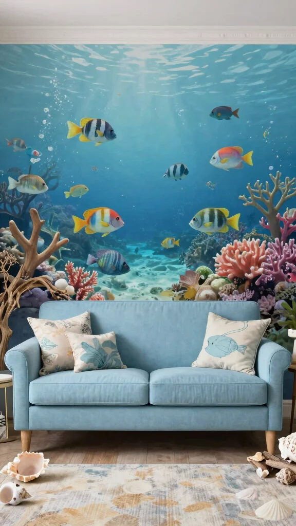 An underwater mural creates a peaceful environment, making your living room an ideal refuge from daily chaos.