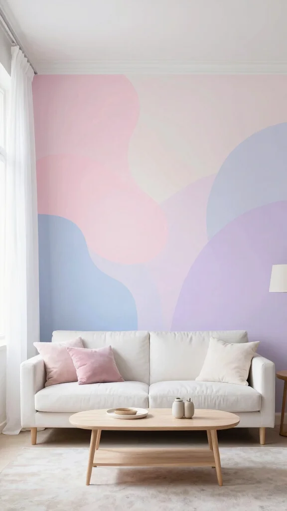 Soft pastel hues can create a soothing, dreamy atmosphere perfect for your living room. A mural painted in gentle shades of pink, blue, and lavender invites tranquility, making it an ideal backdrop for relaxation. Picture a watercolor mural where colors seamlessly blend, creating a calm environment that feels light and airy. Pair this with delicate furnishings and lightweight textiles to maintain a serene and soft aesthetic.