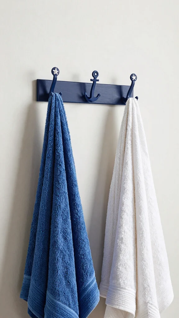 Beach-inspired wall hooks in navy blue offer both functionality and charm to your bathroom. Use these hooks for bathrobes, towels, or decorative accessories, keeping your space organized while adding a unique coastal flair. Designs featuring anchors or starfish can enhance the beachy theme beautifully.