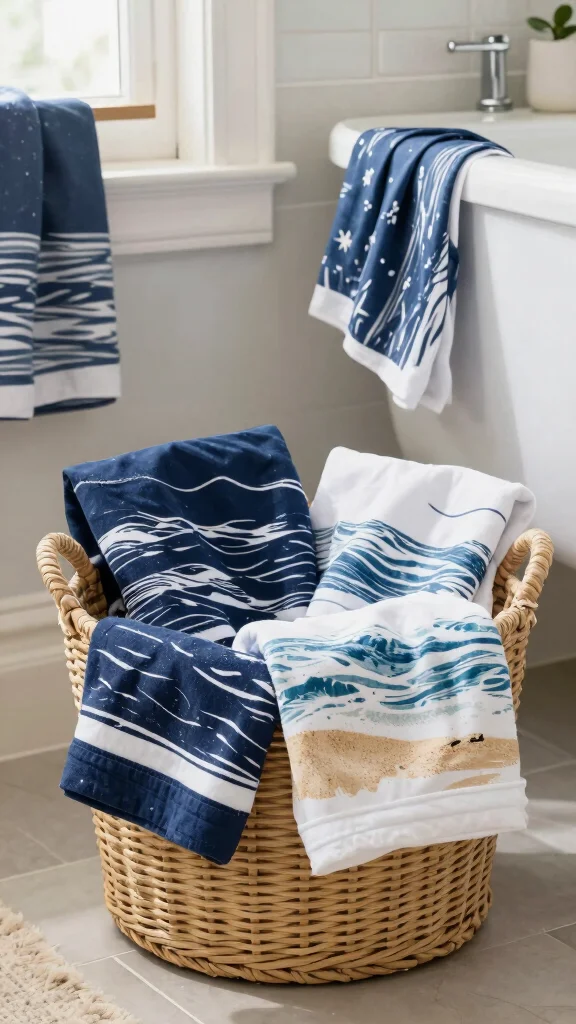 Coastal-themed bath linens bring ocean vibes home—navy blue bathroom accessories with white patterns tie the room together. Choose absorbent, machine-washable fabrics and display them in a basket for easy access. Pro tip: rotate prints seasonally to refresh the bath with minimal effort.