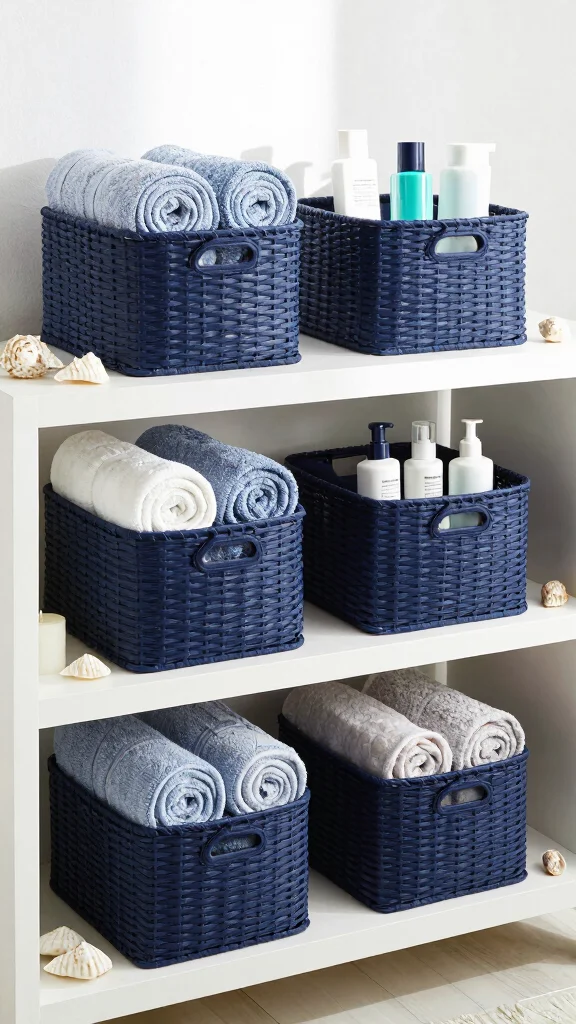 Navy blue storage baskets are both functional and visually appealing, making them perfect for your bathroom. Use them to neatly store toiletries or towels, ensuring a clutter-free environment. Woven materials add a cozy texture that beautifully complements the coastal vibe.