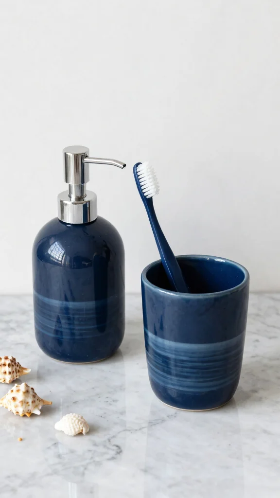 A coordinated set of bath accessories in navy blue can unify your bathroom decor beautifully. Look for sets that include a soap dispenser, toothbrush holder, and tumbler, all designed to complement each other for a cohesive look. This thoughtful approach contributes to a stylish and well-organized space.