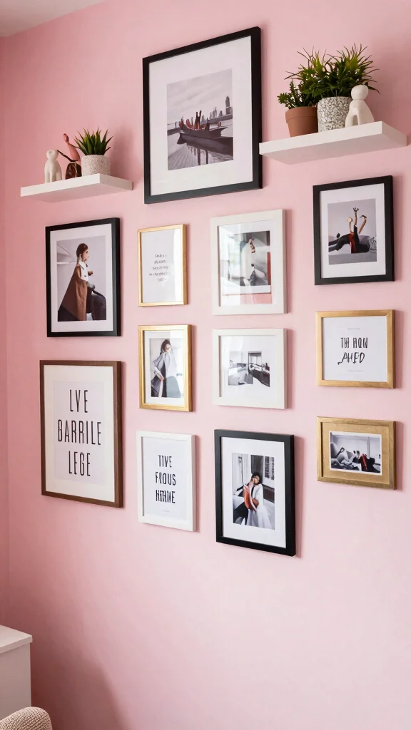A personal gallery wall allows you to express your creativity in your dressing room. Frame a collection of your favorite photos, art pieces, or inspiring quotes in a color scheme that complements your pink decor. Mixing different frame styles adds visual interest, making the space feel uniquely yours.