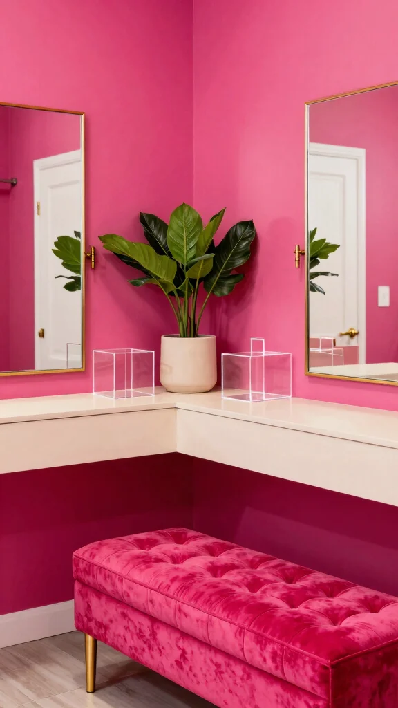 For a chic vibe, consider incorporating gold accents in your mirrors and hardware. Look for budget-friendly options like thrifted pieces that you can easily spray paint to match the fuchsia theme.