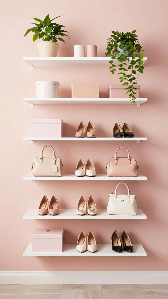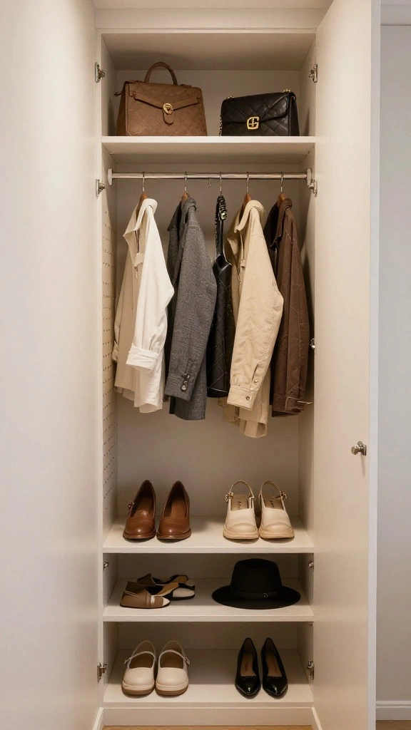 Vertical storage adds organization and can serve as a decorative element, showcasing favorite items like handbags or hats.