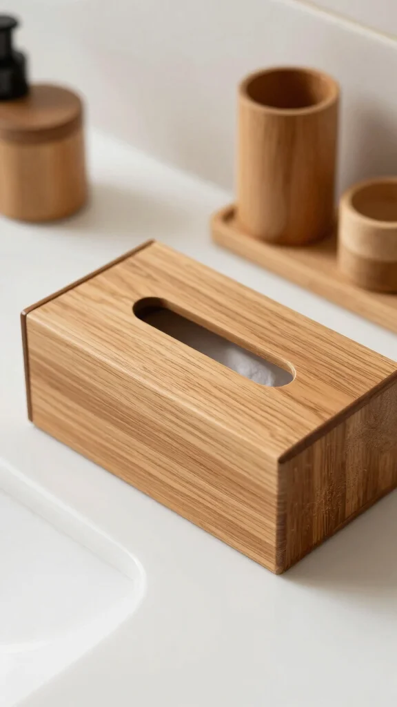 This accessory transforms standard tissue boxes into stylish decor elements, seamlessly blending into your bathroom. The natural wood finish brings warmth, ensuring an organic aesthetic throughout.