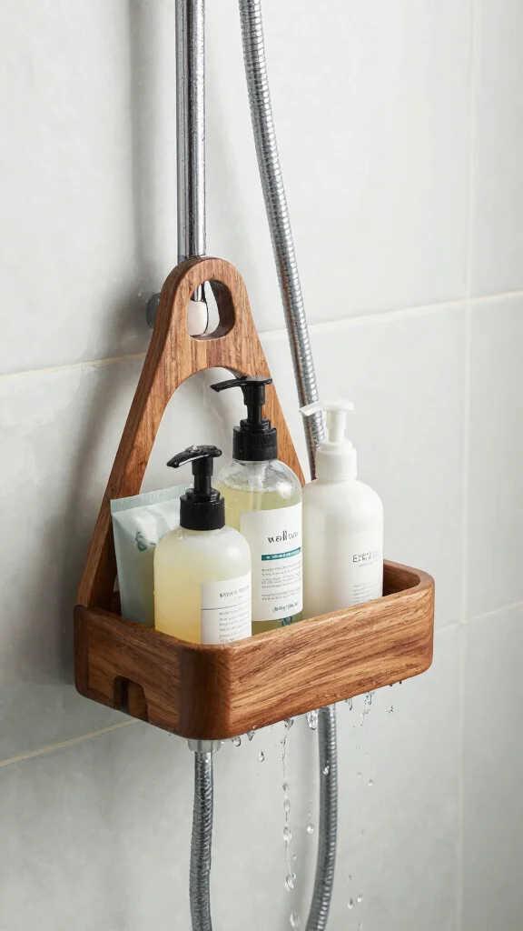 Optimize your space with a teak shower caddy that merges style with practicality.