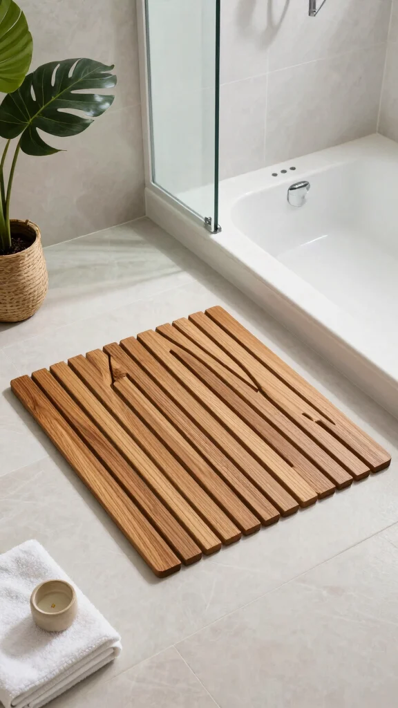 Choose a mat with rounded edges or a geometric design that resonates with your bathroom’s aesthetic, and enjoy the warm feel of wood underfoot.