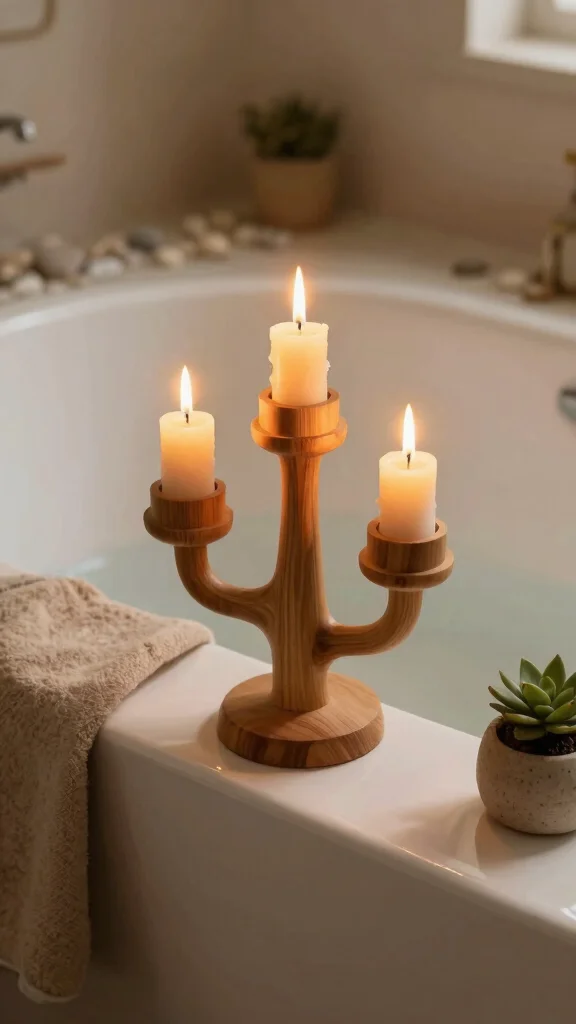 Create a tranquil atmosphere with a teak candle holder that brings warmth and light to your bathroom.