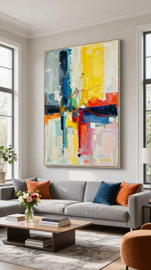 Elevate your living room’s aesthetic with an oversized canvas art piece that captivates the eye. This bold design element establishes a focal point, drawing attention and setting the tone for the entire space. Think vibrant colors or intriguing abstract patterns that complement your decor, such as deep blues paired with warm neutrals or striking monochromes.