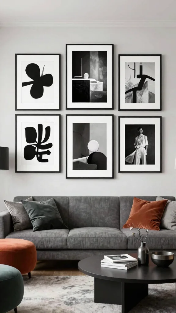 Monochrome art pieces provide a chic contrast, enhancing the overall visual harmony of your living room.