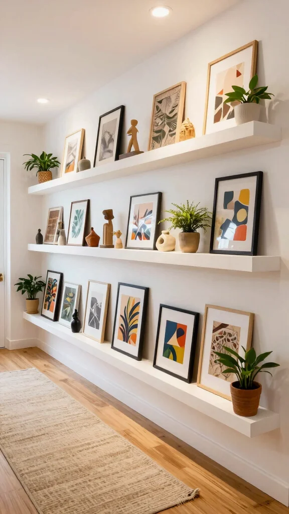 Gallery ledges offer a flexible and stylish way to showcase art without the commitment of hanging each piece. These shelves allow you to easily mix and match art, photos, and decorative objects, making it simple to refresh your hallway’s look. You can create a dynamic display that evolves with your personal style and interests.