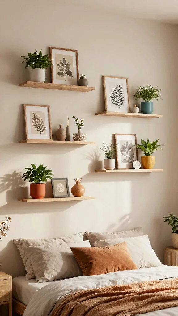 Incorporating wall shelves into your bedroom decor allows you to display art and personal mementos creatively. Bohemian-style shelves can hold an array of items, from art pieces to books and plants, adding functionality to your decor. This approach maximizes wall space while reflecting your unique personality.