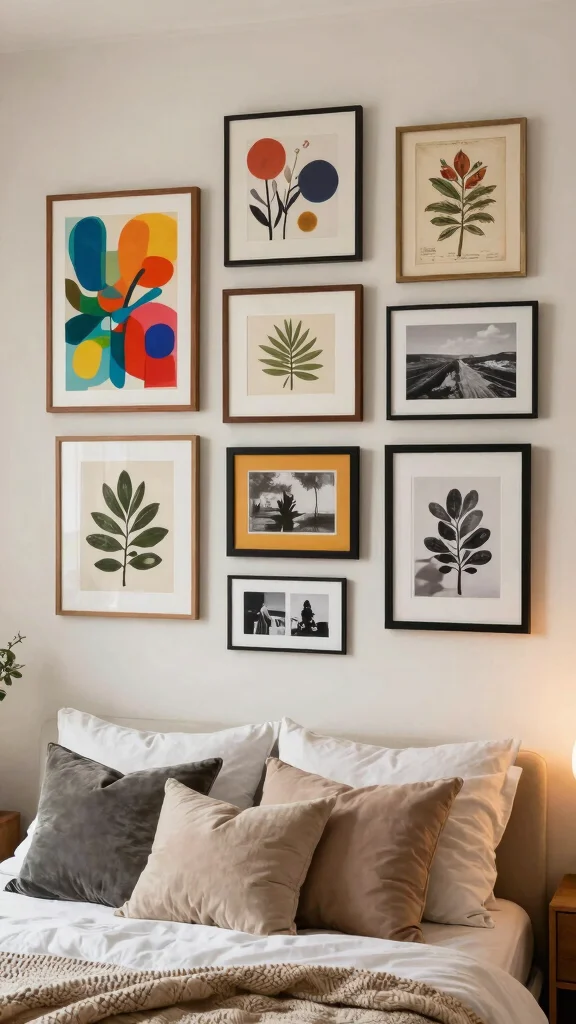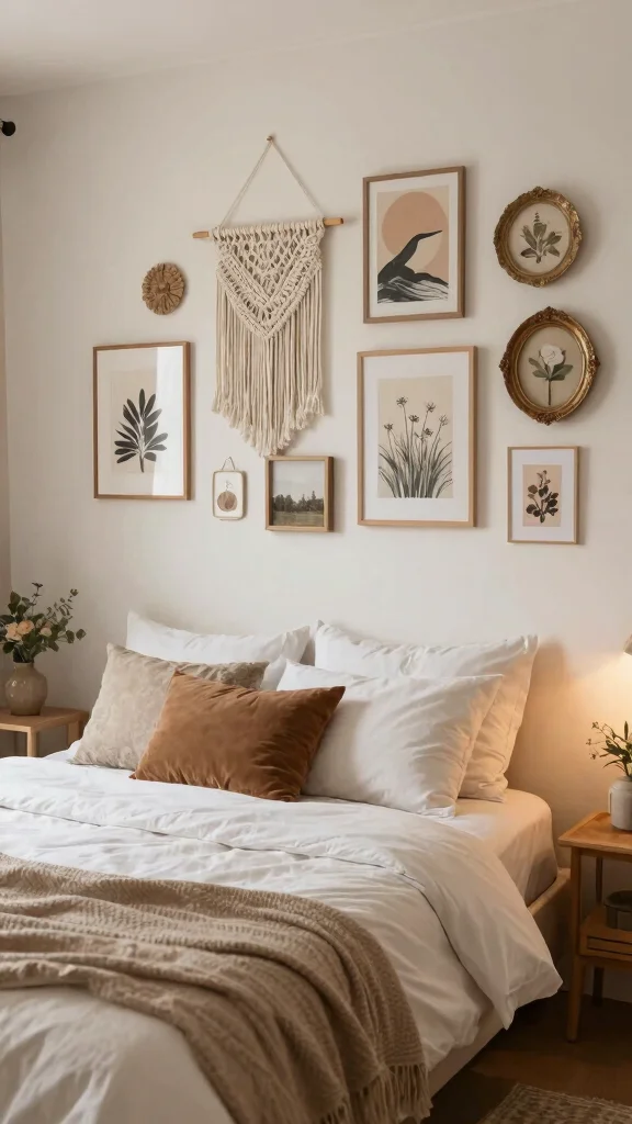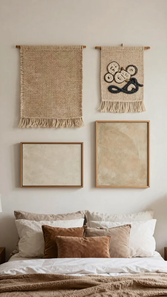 Consider mixing different types of art, including 3D wall hangings and framed textiles. This not only enhances the cozy atmosphere but also makes your sanctuary feel inviting and lived-in.