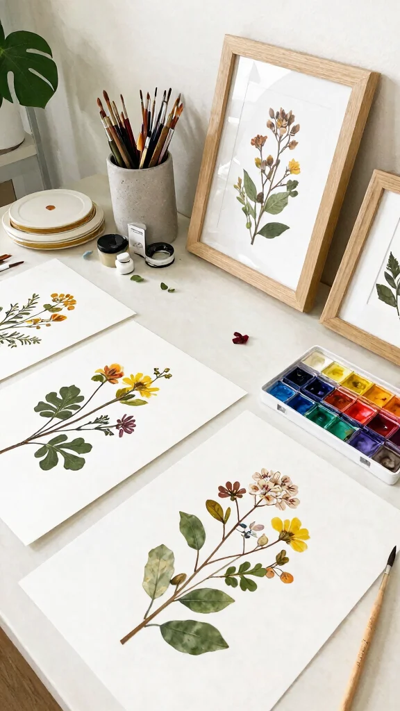 For a classic look, opt for muted colors, or choose vibrant hues for a lively pop. Combining real plants with your botanical art can create a fresh, layered effect that enhances the natural theme.