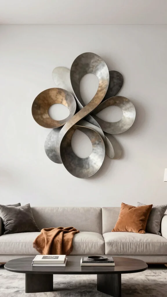 Sculptural wall art allows you to move beyond traditional frames, injecting a three-dimensional element into your living room. Whether made from metal or wood, these pieces create striking contrasts against white walls, adding depth and intrigue while keeping a minimalist feel.