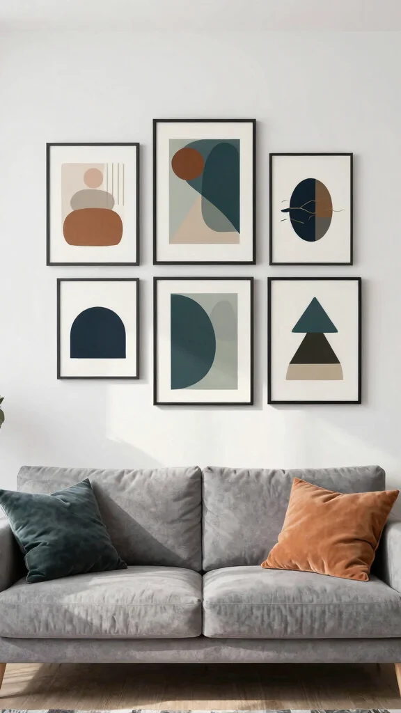 The blend of geometric art and soft palettes enhances the overall sophistication of your living area.