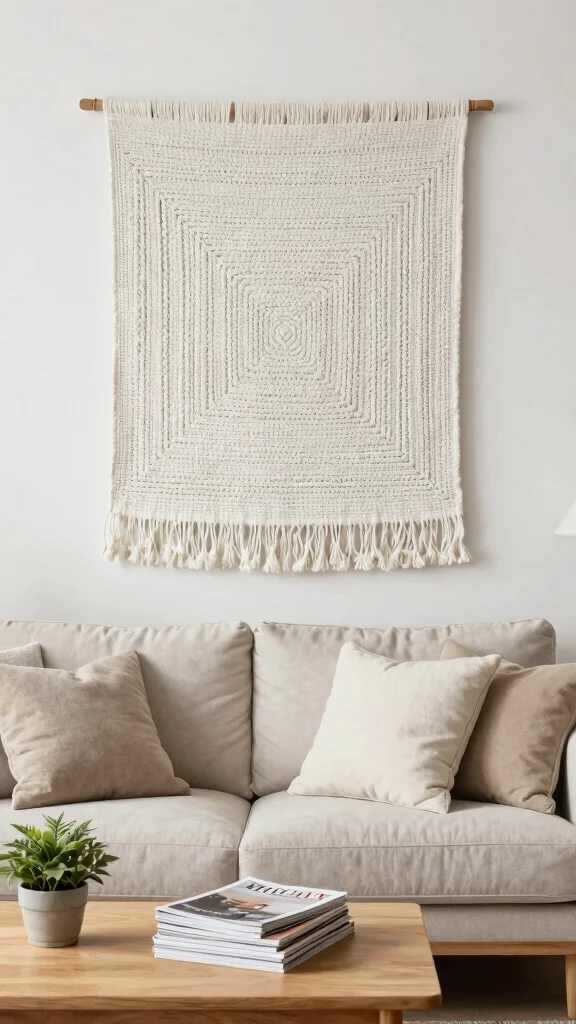 A fabric wall hanging in soft white tones introduces warmth and texture to your living room, creating a cozy ambiance. These pieces, made from materials like woven cotton or linen, contrast beautifully with smooth walls and enhance the inviting atmosphere. When paired with neutral decor, they encourage gatherings and conversations in a relaxed setting.