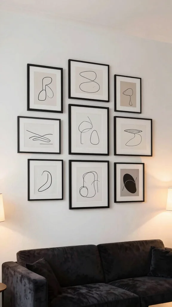 Framed minimalist line art captures the essence of simplicity, perfectly complementing soft neutral living room designs. With their clean black lines against a white background, these pieces promote a sense of calm and elegance. They easily adapt to various decor styles, enhancing the peaceful ambiance of your home.