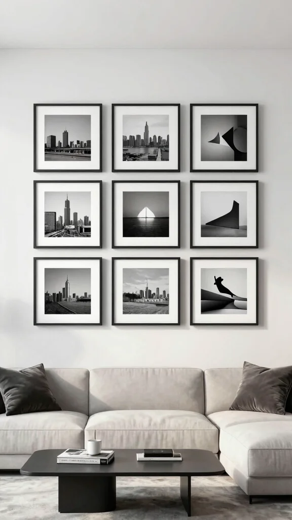 Monochrome photography introduces a modern touch to your living room while keeping with a minimalist aesthetic. Black and white images add a timeless quality, becoming stunning focal points when framed thoughtfully. This style works beautifully with other white wall art, creating a cohesive look.