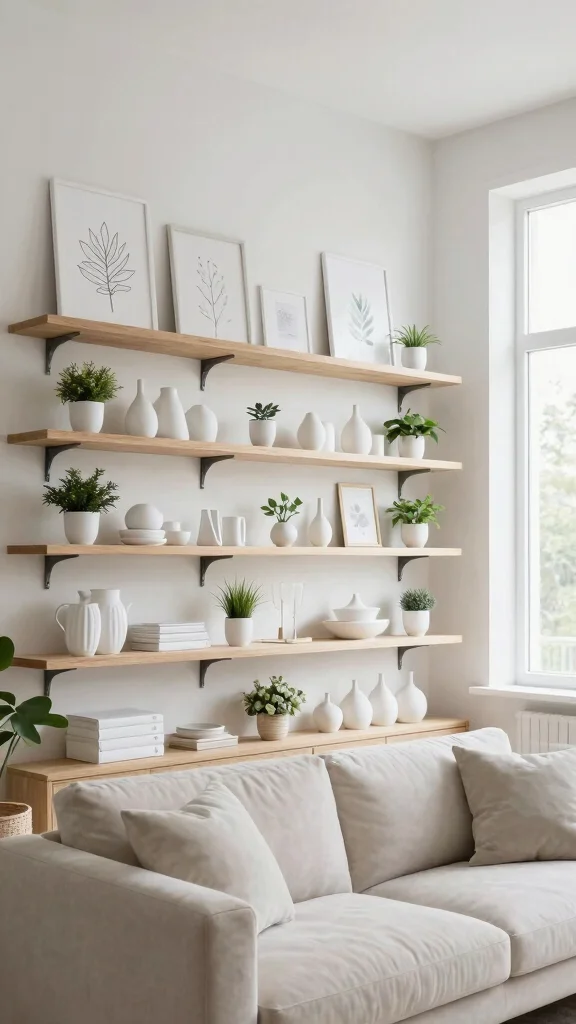 Minimalist wall shelves are a functional and stylish way to display your white wall decor alongside cherished items. Opt for sleek floating shelves that complement your art without drawing attention away from it. These shelves can showcase small plants, books, or decorative pieces that add warmth and character to your living room.