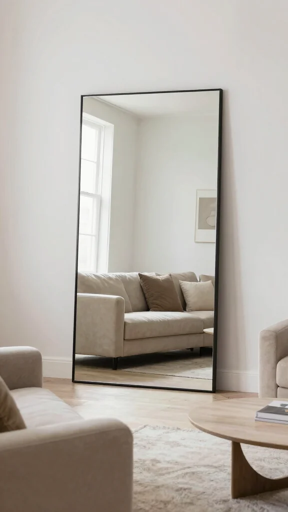 Oversized mirrors serve as both decorative and functional art in your living room, enhancing depth and brightness. A sleek, minimalist frame ensures that the mirror complements your soft, neutral theme while reflecting light throughout the space. This design choice creates an airy feel that makes your room appear more expansive.