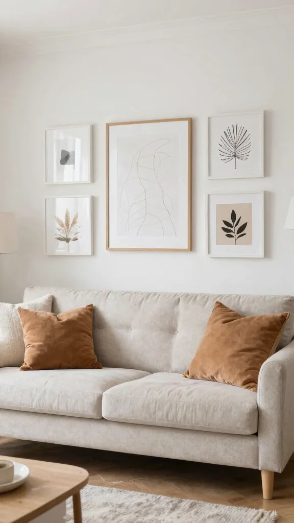 Size and layout tips: measure your wall and sofa length, then aim for art that equals about 60–75% of the sofa width. Center pieces at eye level (roughly 57–60 inches from the floor). For layouts, pick a grid, salon style, or a single large statement piece, and use paper cutouts to preview spacing before hanging. Keep frames uniform or within a cohesive family to maintain neutral home decor harmony. Start with 2–3 pieces and adjust spacing to 2–3 inches for a clean, balanced look in your living room aesthetics.