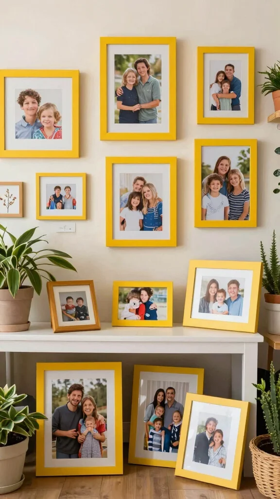– Create a gallery wall with yellow-hued frames featuring family memories.