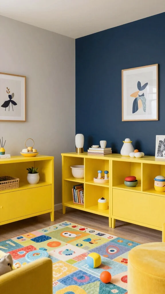 Yellow rugs can beautifully ground the room’s design while complementing lighter furniture, creating a cozy and inviting play area.