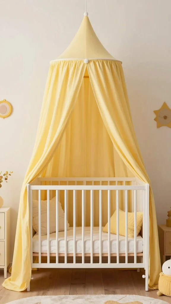 Enhance your yellow baby room with a whimsical canopy over the crib or play area. Soft fabric canopies create a cozy nook, adding a magical touch to the space. Seek eco-friendly materials like organic cotton or linen to ensure both safety and comfort for your baby.