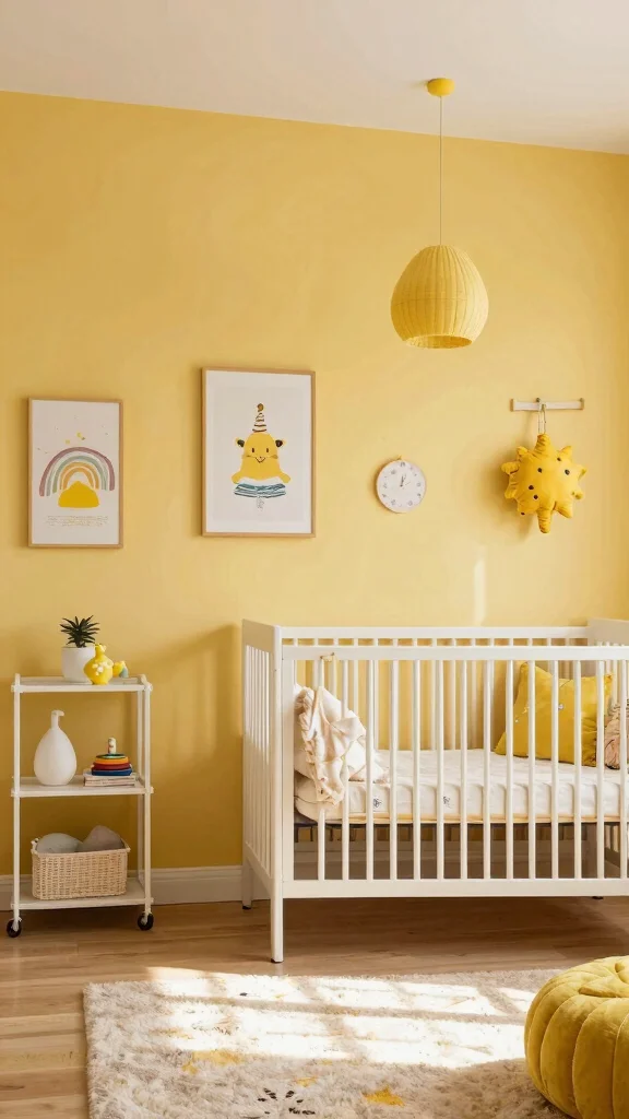 – Sunny Walls: Bright yellow walls can create an uplifting atmosphere and serve as a cheerful backdrop for your nursery decor.