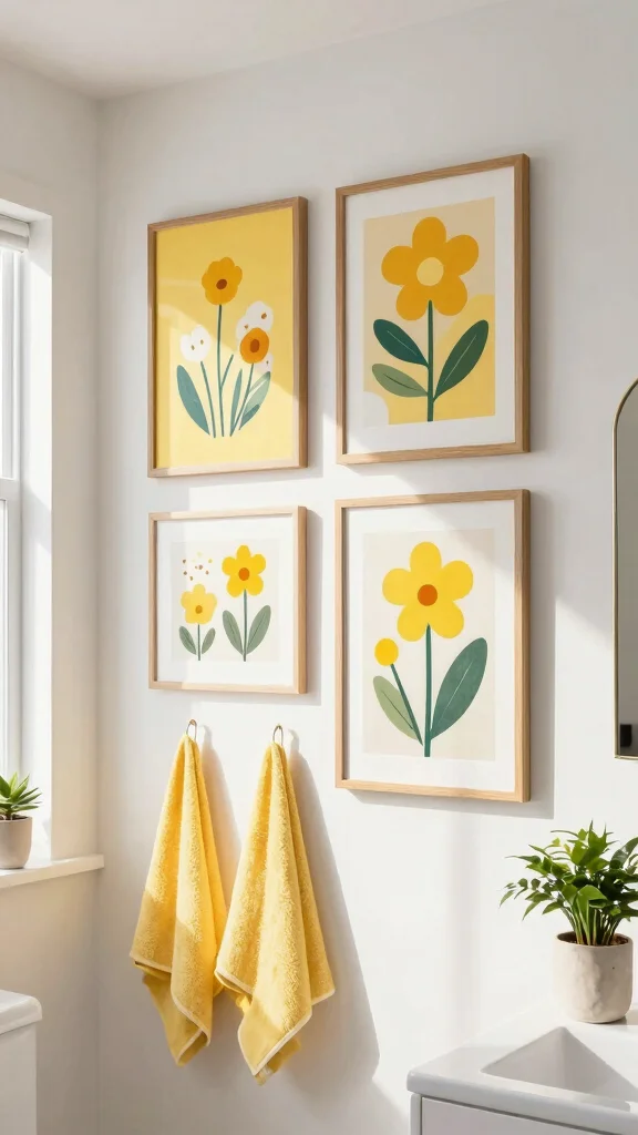 Infuse your bathroom with personality through colorful yellow wall art that reflects your unique style. Eco-friendly prints on recycled paper can brighten your space while serving as delightful conversation starters. Look for designs featuring inspiring quotes, nature scenes, or abstract patterns to elevate your decor.Hang these art pieces above towels or near mirrors for maximum visual impact. Choose frames made from sustainable materials to keep your eco-friendly theme consistent.Quick Tips:– Opt for removable adhesive options for easy mounting.