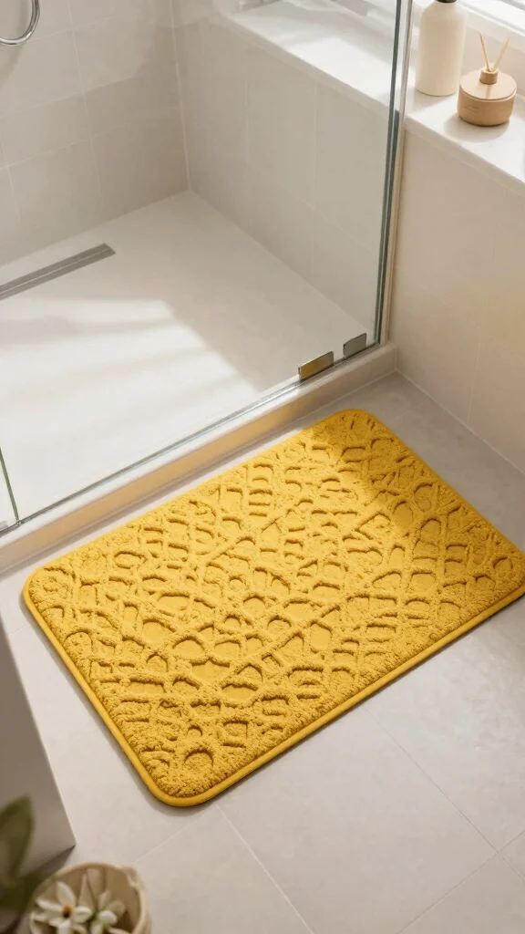 A fluffy yellow bath mat is the perfect blend of functionality and flair for your bathroom. This cheerful addition not only brightens your floor but also provides a soft, comfortable landing for your feet after a shower. Opt for mats made from eco-friendly materials, like recycled fibers, to enhance both style and sustainability.Choose patterns like chevron or mosaic to add a touch of personality to your space. Prioritize quick-drying mats with anti-slip backing to ensure safety while elevating your decor. Coordinate with matching towels and your shower curtain for a well-rounded theme.Quick Tips:– Ensure it’s machine washable for easy maintenance.
